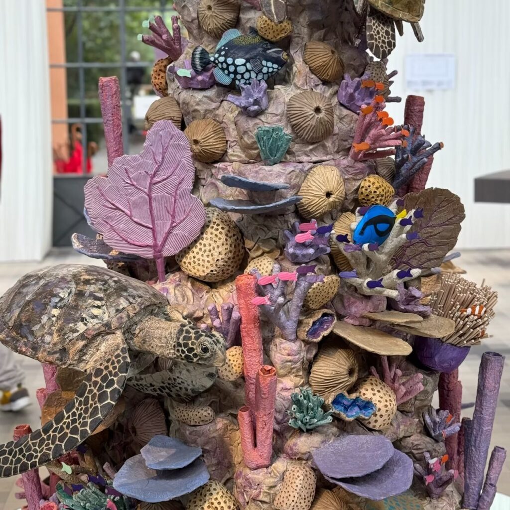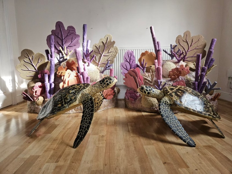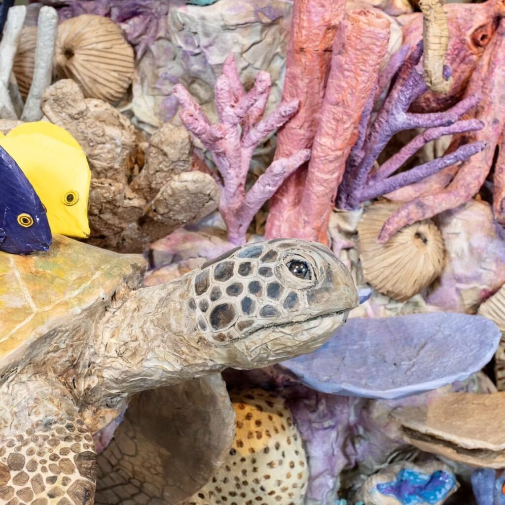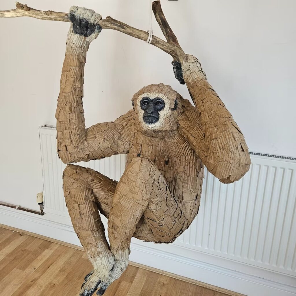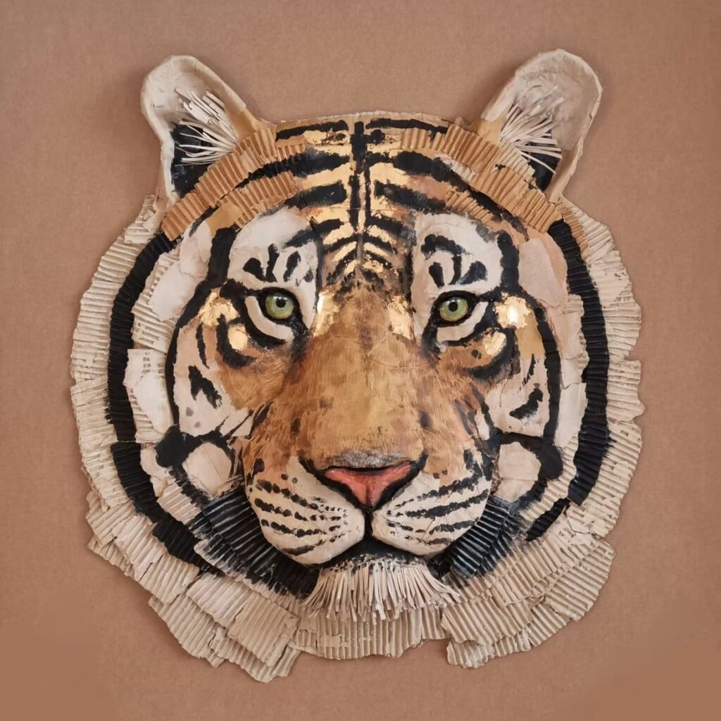 Каждая скульптура создается без отходов, из многослойных листов, которые формируют удивительную глубину, текстуру и цветовые вариации. Гофрированный картон превращается в кожу, панцирь или мех, а складки и изменения цвета добавляют характер и эмоции.