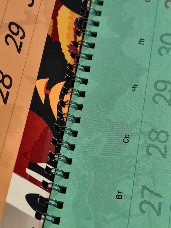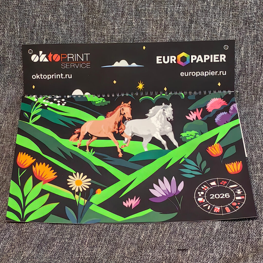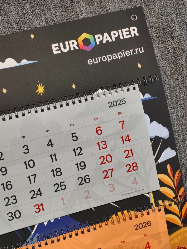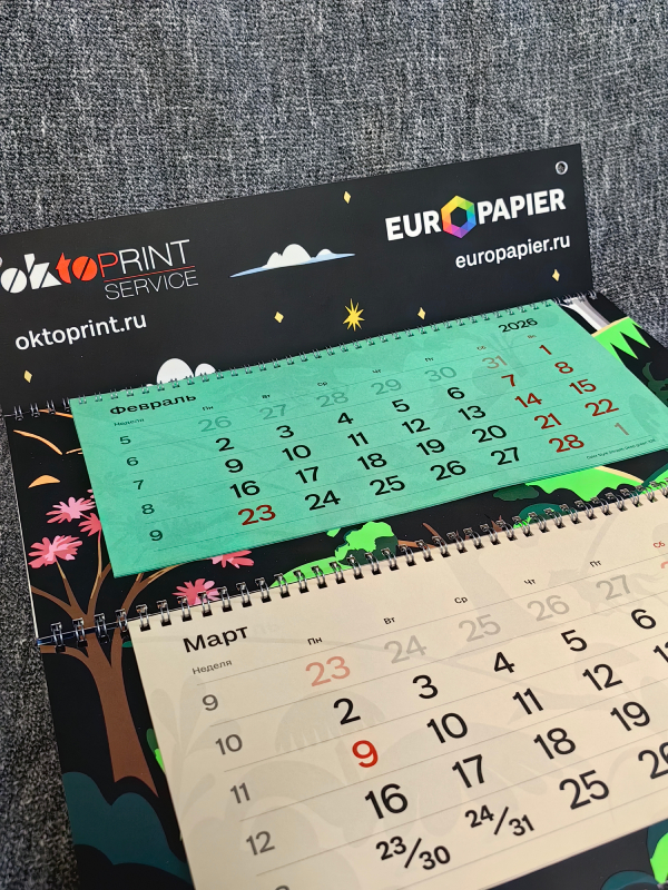 Новый квартальный календарь от компаний «Европапир» и «ОктоПринт Сервис», как всегда, вышел оригинальным и ярким. Всё благодаря опыту специалистов компаний и тщательно подобранным печатным материалам, офсетным УФ-краскам, лакам и плёнкам для выделения контрастов и оформления декоративных элементов. Печать, послепечатная обработка и сборка календаря выполнены на полиграфическом комбинате АО «Картон-Полиграф».
