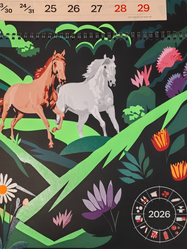 Календарная линейка традиционно представляет собой четыре месяца вместо стандартных трёх. Для блоков были выбраны серая (Grey 316), оранжевая (Orange 319), зелёная (Deep Green 328) и бежевая (Beige 323) дизайнерская бумага из коллекции Color Style Smooth. Подложки изготовлены из картона KAMA Strong российского производства. Они объединены ярким многоплановым дизайном в декоративном стиле, в котором сочетаются различные сюжеты из живой (лошади, цветы) и неживой природы (горы, облака).