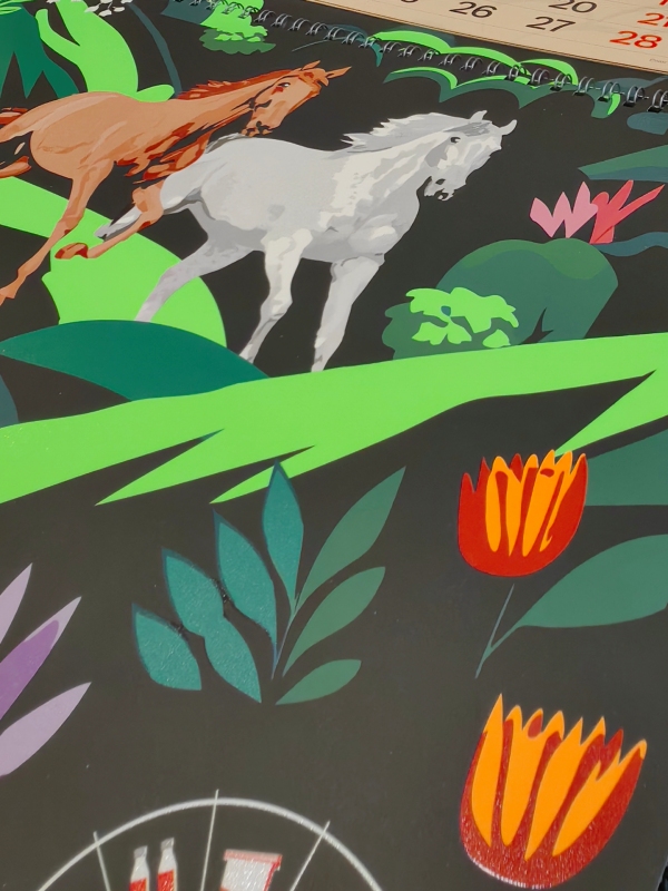 «Выделить контрастные элементы подложек позволило использование триадных офсетных УФ-красок RENK® UV LED SPIDER и флюоресцентных пантонов RENK® HU OFFSET UV LED FLUORESCENT. Глубину черного цвета фона подчеркнули не только светлые и темные плашки растительных узоров, но и сплошное ламинирование софт-тач пленкой BOPP SOFT TOUCH MATT THERMAL. Текст и числа на календарных блоках печатали базовыми УФ-пантонами UV PANTONE Warm Red и Black». – пояснили в компании «ОктоПринт Сервис».