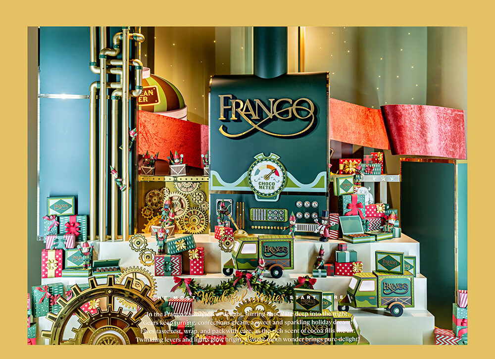 Затем атмосфера меняется, и мы попадаем в причудливый мир шоколадной фабрики Frango, где изготовление культовых чикагских шоколадных конфет превращается в радостный танец движения и озорства. Крошечные конвейерные ленты, миниатюрные вагончики и тщательно спроектированные бумажные механизмы привносят в сцену энергию и юмор — напоминание о том, как движение и повествование могут прекрасно сосуществовать в статичном среде.