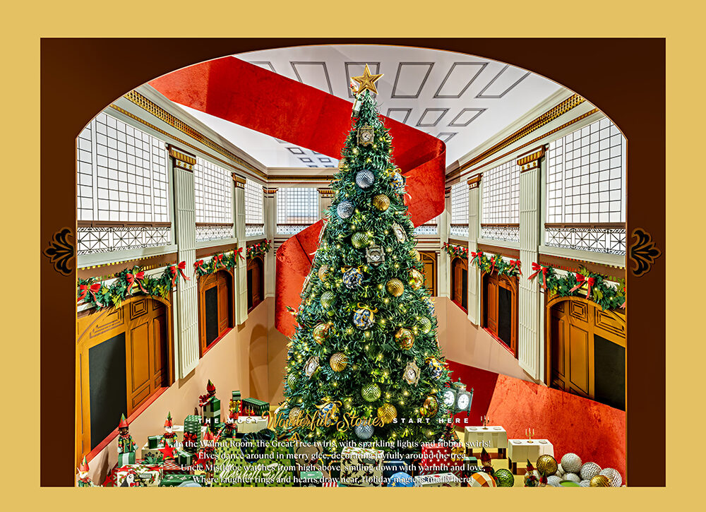 Далее повествование плавно переходит в одно из самых любимых праздничных мест Чикаго: «Ореховый зал». Озаренная теплым, уютным светом, легендарная Рождественская Ель (Great Tree) возвышается на несколько уровней, её ветви оживают эльфы, которые усердно готовятся к сезону. Среди украшений, вдохновленных наследием универмага Macy’s, посетители могут заметить знакомый силуэт дядюшки Омелы (выдуманный персонаж – помощник Санта-Клауса – прим.) — деталь, которая вознаградит тех, кто задержится и присмотрится повнимательнее.