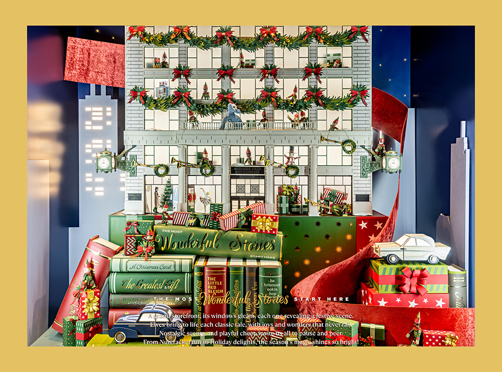Это чувство радости переходит в дань уважения золотому веку рождественских витрин 1940-х и 50-х годов. Здесь представлен стилизованный фасад на Стейт-стрит, украшенный миниатюрами, которые напоминают о любимых классических произведениях, таких как «Щелкунчик» и «Рождественская история». Это отсылка к временам, когда праздничные витрины стали культурным ритуалом — чем-то, вокруг чего семьи год за годом планировали свои выходы в свет.