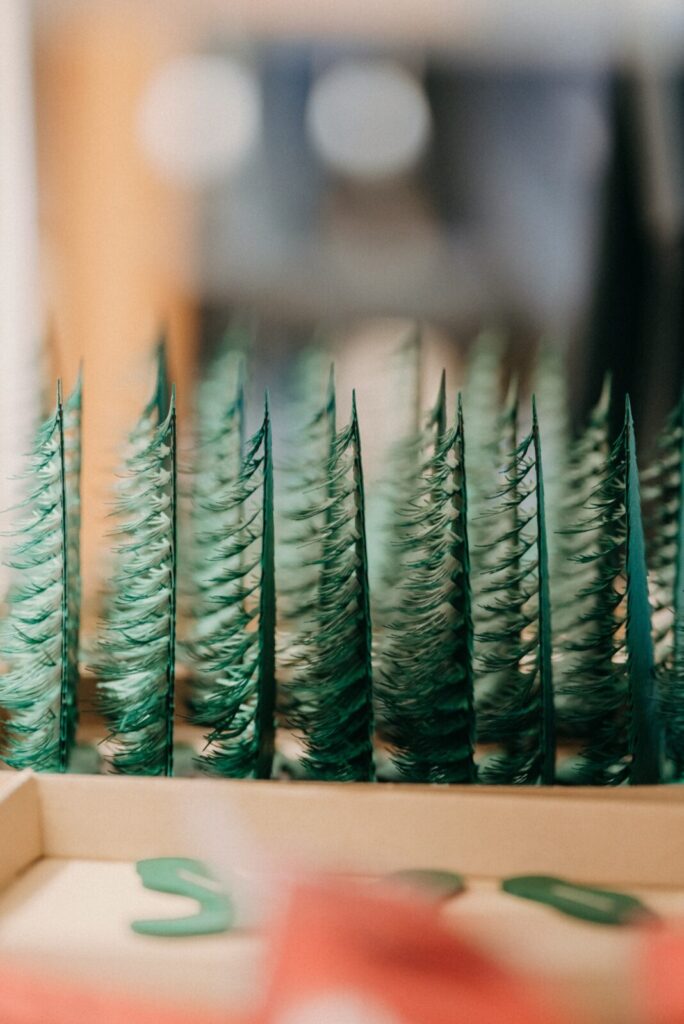 Среди ключевых материалов были выбраны бумаги из европейских коллекций Европапир (не поставляются в Россию): Color STYLE Smooth плотностью 300 г/м2, Remake плотностью 250 г/м2, и Sumo толщиной 1 мм. В качестве дополнительных использовались Crush 250 г/м2, Glam Gold 250 г/м2, IQ Color Ivory 120 г/м2, Mirror 300 г/м2, Munken Pure 120, 240 и 300 г/м2, а также Munken Polar 300 г/м2. Каждая коллекция была тщательно подобрана, чтобы обеспечить тонкие вариации тона, поверхности и отражающей способности. Все вместе эти материалы образовали палитру, которая привнесла теплоту, контраст и объемность в миниатюрные миры, позволяя свету и тени играть на деталях ручной работы.