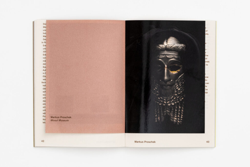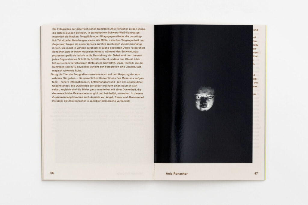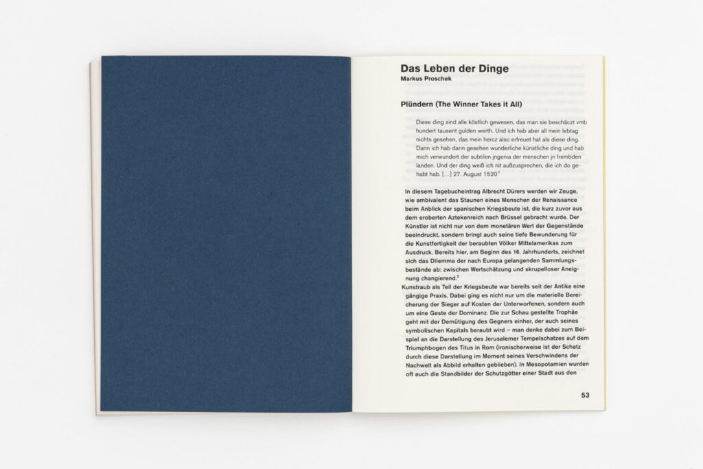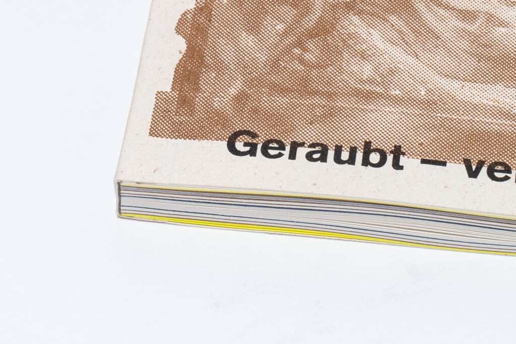 Таким образом, разнообразие материалов создаёт яркие, тактильные ощущения при чтении, отражая многослойные и сложные истории, рассказанные внутри. Особое внимание было уделено балансу прочности и сенсорики. Как объясняют Шильдген и Гассер: «Мы хотели создать каталог, который ощущался бы живым, ярким и сверкающим. Обложка из бумаги Remake Carapace Oyster с её прекрасной тактильной поверхностью придаёт изданию снаружи очень своеобразный, живой вид и дополняет простую двухцветную чёрно-металлическую графику глубиной и текстурой. Внутренняя бумага используется для структурирования и разделения содержимого, делая эти различия заметными с первого взгляда». В качестве материала используются Munken Pure Rough 90 г/м², IQ Color Neon Yellow 80 г/м², Bindakote white 80 г/м², Esprit de Nature ocre 110 г/м², а также Color STYLE Recycling Tobacco 120 г/м² и Crush Lavender 120 г/м² (данные коллекции не поставляются в Россию).